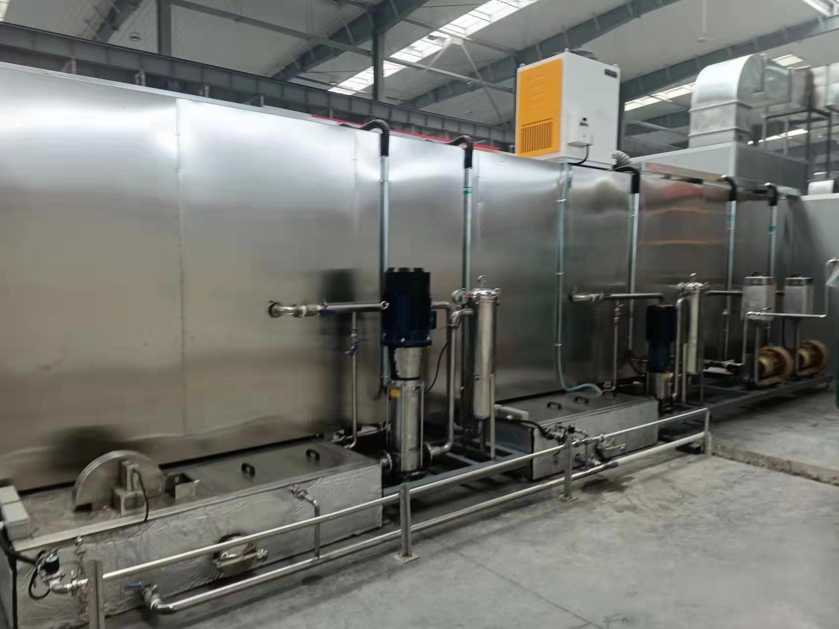 清洗工艺:自动进料→①液下旋流除油清洗→②超声清洗→③喷淋清洗→④喷淋防锈→⑤风切吹干→⑥热风烘干→自动出料